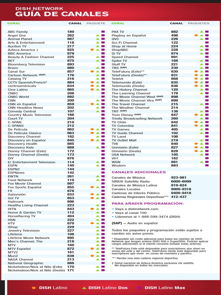 Latino Dish Channel Guide / Dish Latino - Download file pdf dish latino.. He also showed me how to use the remote and guides. The dishlatino básico package includes over 30. But with so many options it can be daunting service technician was very professional and quickly installed my equipment. Dish network offers five channel packages for spanish speaking customers. In base packages, you'll find espn, espn2, espn3, fox sports 1, espn deportes, fox deportes.